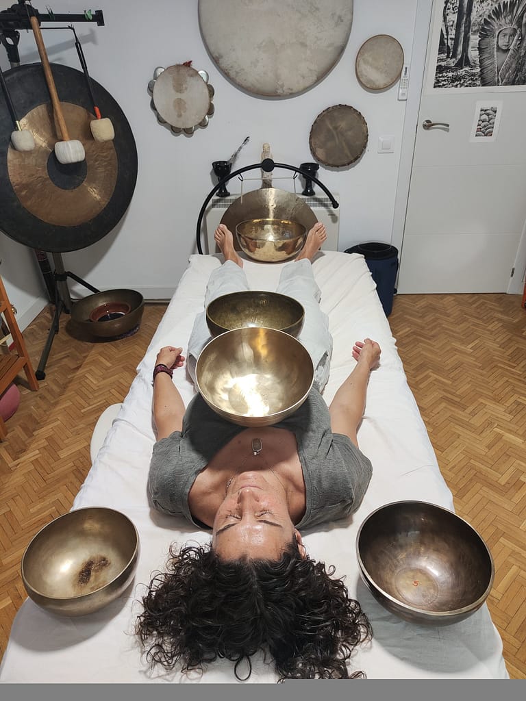 En sesión utilizo cuencos tibetanos y de cuarzo, gongs, voz y diapasones calibrados, combinando distintas frecuencias según el estado físico y emocional de la persona. El trabajo se realiza en formato individual y terapéutico.